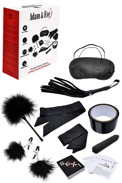 Ignite your passion and explore uncharted territories of pleasure with the Adam and Eve Midnight Moods 10-piece Couples Bondage Set. This exquisite collection is designed for couples looking to enhance their intimacy and dive into the thrilling world of bondage.