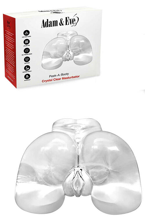 Crafted from crystal clear, real-feel material, the Peek-A-Booty is shaped to look like a realistic woman’s booty with jiggling cheeks, inviting vulva and extra tight pucker.
