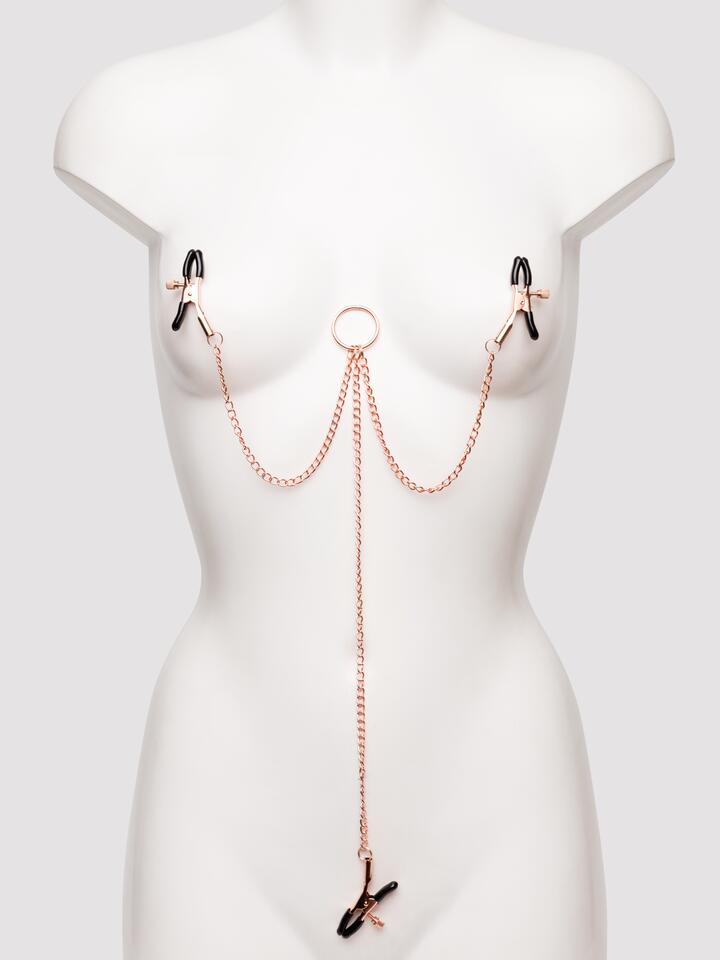 Become a happy clamper with this shimmering set from Bondage Boutique. Featuring three adjustable crocodile clamps linked by a rose gold metal chain, this sensational accessory adds a satisfying pinch to your pleasure session. Simply place each smooth, PVC-tipped clamp on either side of your nipple and tighten until you achieve a level of pressure that suits you. Add the clit clamp into the mix to send your sensory play into new realms of erotic excitement. Mini O-rings connect each chain, allowing for additional weight and restraint accessories.