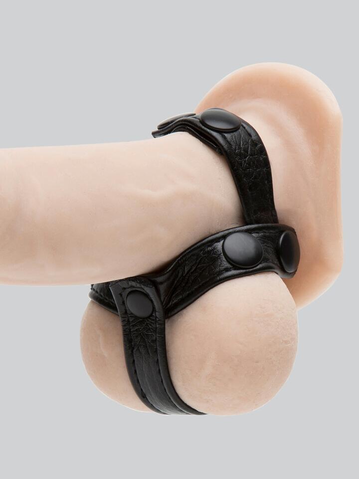 In the bondage world, we all know that tight is right, so this T-style cock ring and ball divider is ideal for men who love restrictive stimulation. Made from faux leather, the ring clips around your shaft and each ball for hard-on enhancing sensations. With adjustable snap poppers that offer the ultimate fit for optimum results, this vegan-friendly cock ring adjusts easily to suit you. While the main ring offers a comfortably snug fit around your shaft and both balls, the T-bar splitter adjusts to grip each individual ball with just the right level of restriction for intermediate players. Wear during solo or shared fun to enhance your erection and perform for longer.