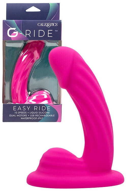 Get the ride you’ve been craving with the Easy Ride from Calexotic’s G-Ride collection. Designed with a curved, semi-realistic shaft and tip, this textured G-Spot vibe rocks 10 different vibration speeds to satisfy your cravings, and a textured grinder pad for external clitoral stimulation. Crafted from super soft liquid silicone, it is an exceptionally smooth ride, while the suction cup base attaches to any smooth, flat surface for hands-free pleasure. As an added bonus the entire thing is fully waterproof so you can take it into the shower, tub, or spa for some wet and wild pleasure.