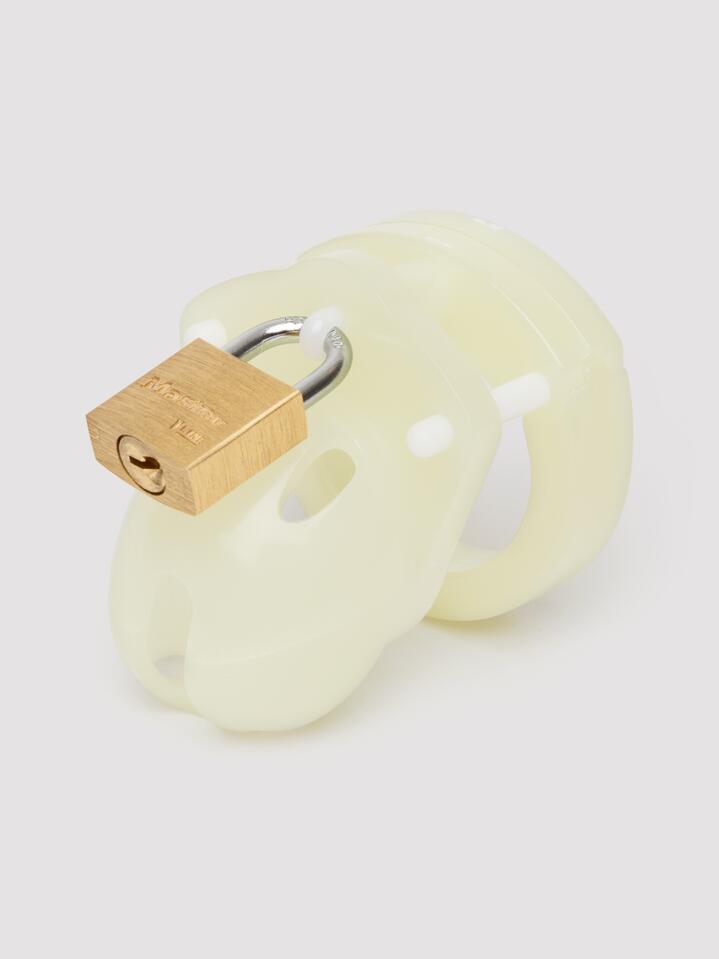 Light up your BDSM play sessions when you trap your manhood with the CB-X Mini Me Glow-in-the-Dark Chastity Cage Kit. Crafted from 1.25 inches of body-safe, medical-grade ABS plastic, this petite yet premium chastity cage system is transparent, vented and tailored to fit your cock. Designed for short-term and long-term wear, this cage is durable and super safe to use. It boasts a functional opening for urination/ejaculation without having to remove it, plus it comes with a set of plastic padlocks for when discretion is most needed, like at airport security. This all-inclusive kit comes with 5 U-rings, 3 locking pins, 3 spacers and 1 brass lock with 2 keys for the best chastity experience for both beginners and experienced chastity wearers. To activate the Glow-in-the-Dark feature and transform your chastity play into a lunar lockdown, the cock cage, U-rings and spacers must be exposed to light. Its charge time also depends on the type of light it is exposed to: It is 3-4 minutes of UV/Blacklight, 7-8 minutes of direct sunlight, 21-23 minutes of fluorescent light (strip lighting or energy-saving bulbs) and 24-26 minutes of incandescent light (standard filament bulbs). This kit comes complete with a black drawstring storage bag, premium lube pack, and user manual. As with all male chastity devices, always remove before sleeping. Vital Stats: Cage measures 1.25 inches in length and 1.375 inches in diameter for comfortable restraint. 5 sizes of U-ring enable the perfect fit (1.5″, 1.625″, 1.75″, 1.875″, 2″).