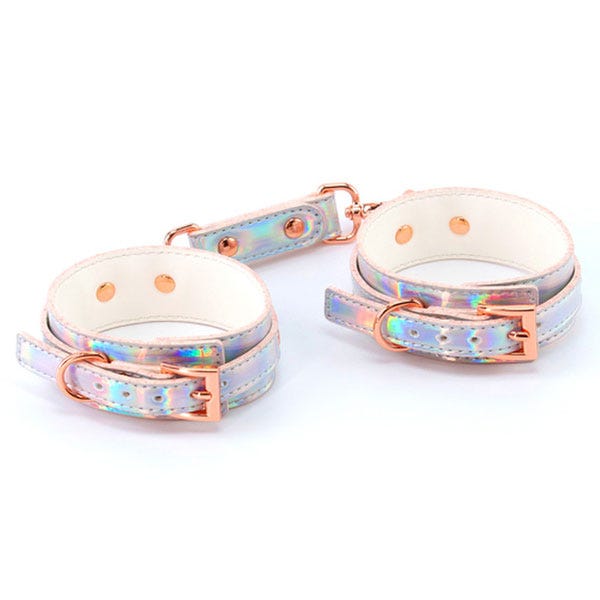 Elevate your BDSM experience with the stunning Cosmo Bondage Holographic Rainbow Wrist Cuffs. With a mesmerizing holographic finish and chic rose gold nickel-free hardware, these cuffs are not only visually striking but also designed for comfort and durability.