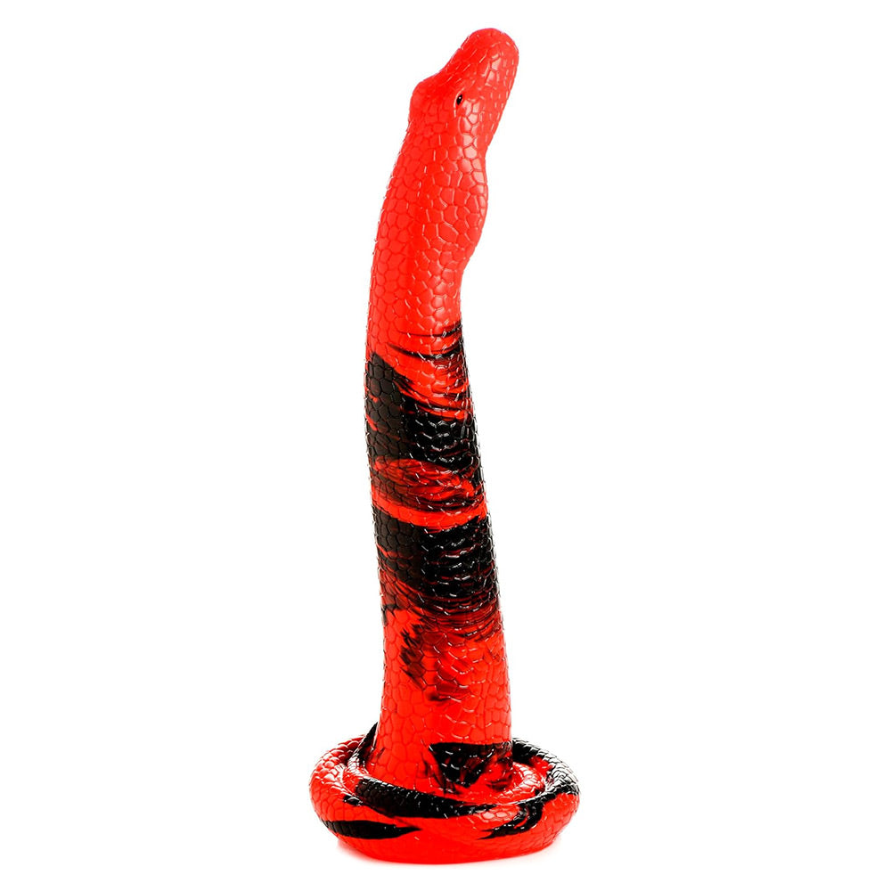 Step into a world of tantalising pleasure with the Creature Cocks King Cobra Large Dildo. This stunning 14-inch masterpiece, adorned in captivating red and black scales, is designed to awaken your senses and elevate your intimate experiences. Its impressive length and sinuous texture will draw you in, making it the ultimate companion for those daring enough to venture into the wild side of pleasure. Are you ready to charm your way to ecstasy?
