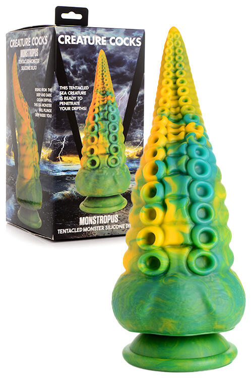 Made from premium, body-safe silicone, the Monstropus features a stunning marbled design in vibrant green, yellow, and blue hues. Its tapered tip ensures easy insertion, while the chunky base provides stability and control. The dual rows of cephalopod suckers and a pronounced ridge enhance stimulation, making every use an unforgettable experience.