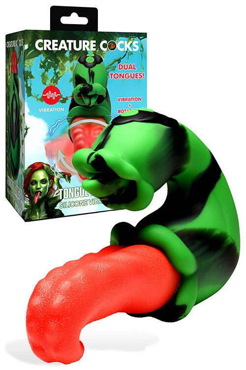 With its striking black and green design, the Tongue Lasher features two unique stimulation points: a powerful vibrating mouth that targets your clitoris and a textured, bright red tongue that flicks and swirls to perfection. Experience the ultimate in dual stimulation as you explore the: