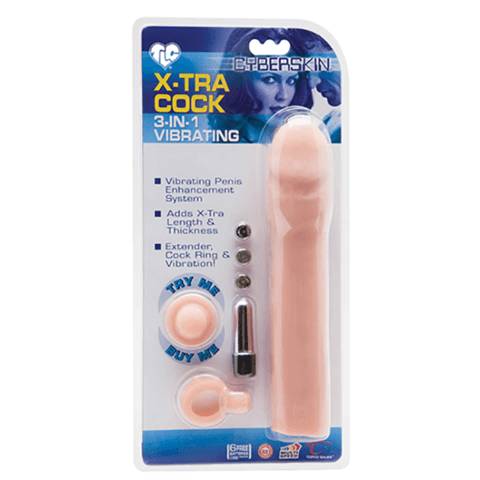 Unleash a new realm of intimacy with the CyberSkin 3-in-1 Vibrating X-tra Cock. This innovative penis enhancement system not only adds extra length and thickness but also delivers incredible sensations for both partners. With its adjustable cockring and multispeed bullet, experience pleasure like never before!