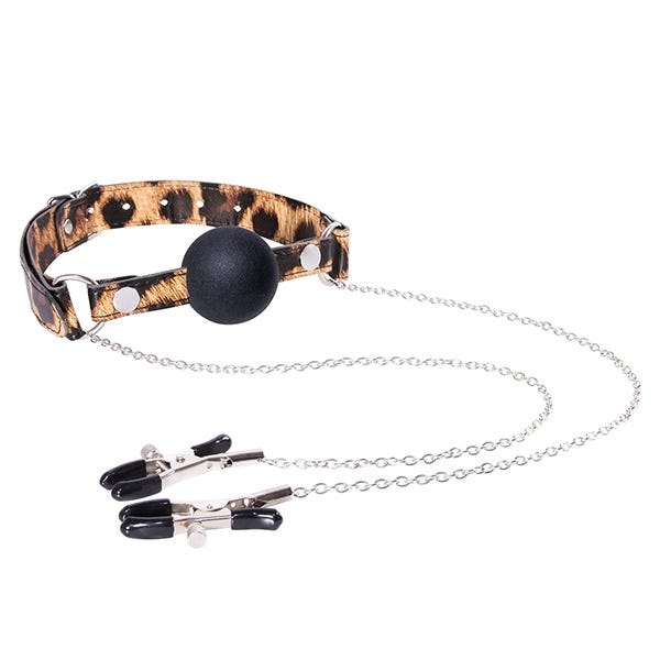 Indulge in the wild world of power play with the Excellent Power Fetish Leopard Frenzy Leopard Print Gag Ball with Nipple Clamps. Designed for couples seeking a mix of style and sensation, this enticing set features a leopard-print faux-leather collar and nipple clamps, perfect for exploring your fantasies together.