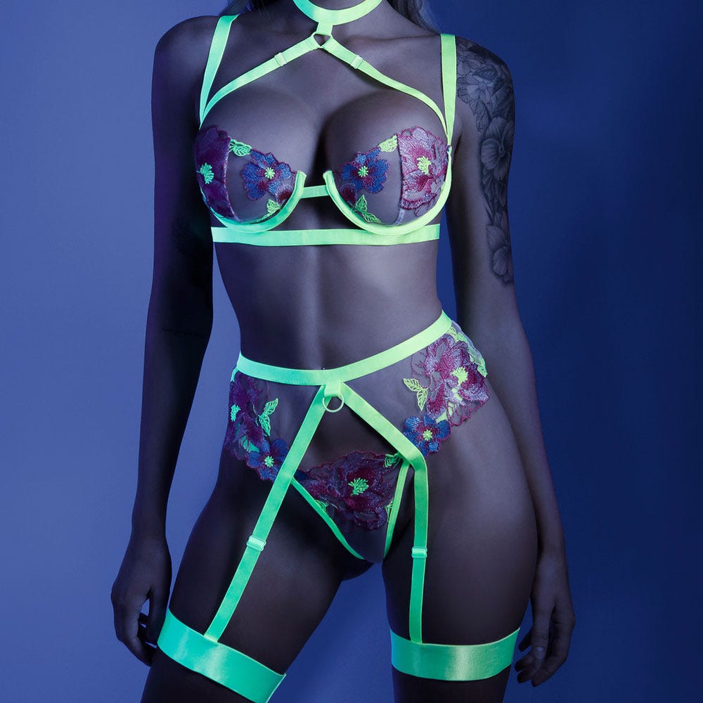 Step into a world of allure and enchantment with the Fantasy Lingerie Glow In A Trance Bra, Garter & Panty Set. This captivating ensemble features delicate floral embroidery and a unique harness bra design, providing both style and comfort. Make a statement and embrace your confidence as you wear this magical set, designed to make heads turn and hearts race.
