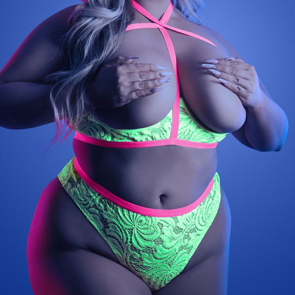 Unleash your inner goddess with the Fantasy Lingerie Glow Persuasive Open Cup Bra & Panty Set. This daring ensemble is designed to captivate and command attention, perfect for your next night out or a special occasion. The glow-in-the-dark properties ensure you shine brightly in any setting, especially under black lights. Crafted from UV-reactive floral lace, this set is not just a piece of lingerie; it’s an experience.