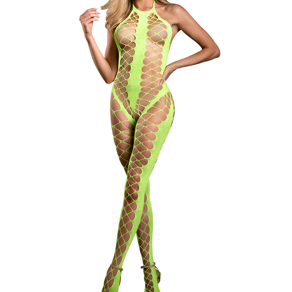 Make an unforgettable statement with the Fantasy Lingerie Unstoppable Crotchless Rhinestone Bodystocking. This eye-catching neon green piece is designed to turn heads and light up the night, thanks to its curve-hugging rhinestone knit that sparkles with every move. The daring crotchless design adds an element of playfulness, perfect for those special nights.