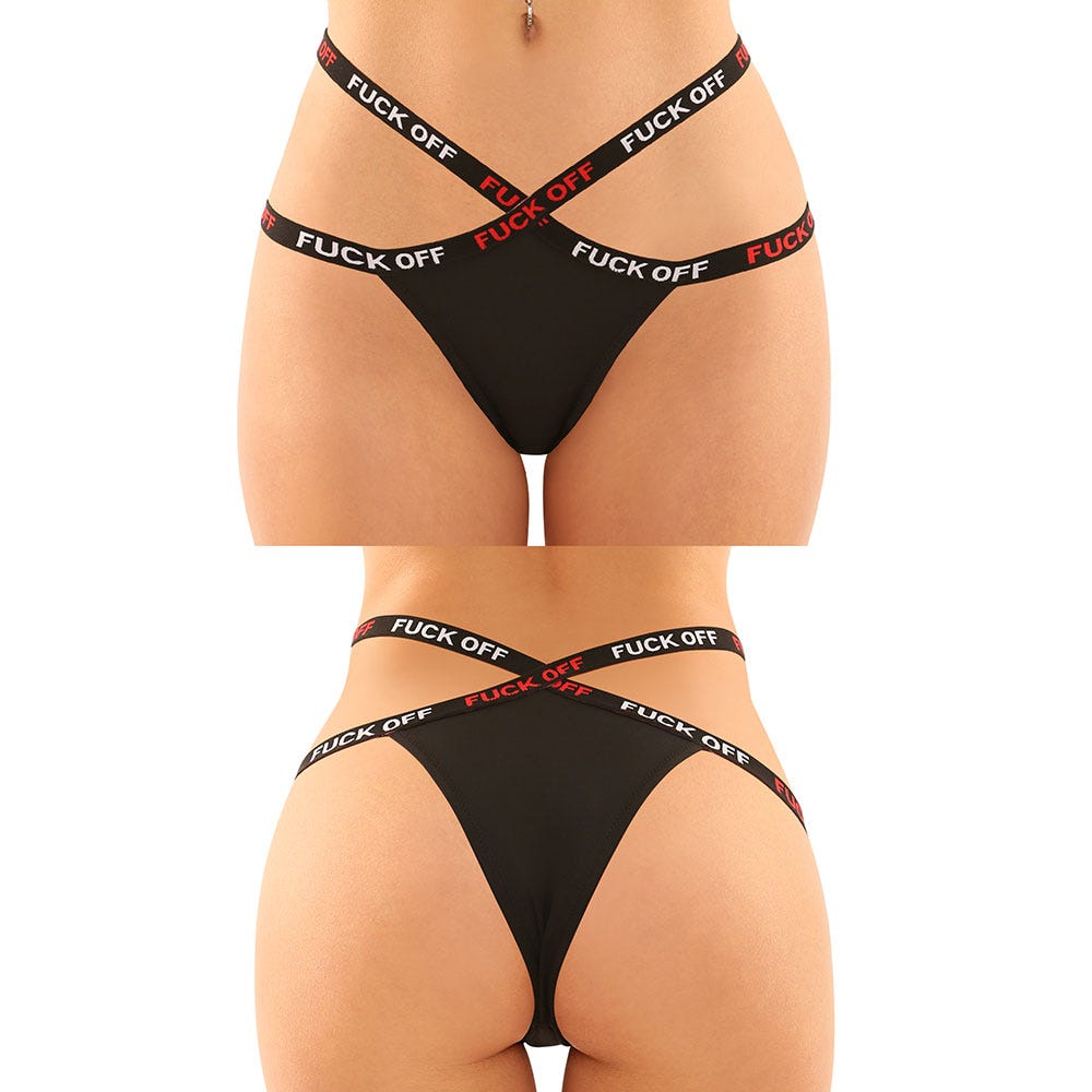 Features: Cutout lace panty, caged micro-thong, bold 'Fuck Off' elastic