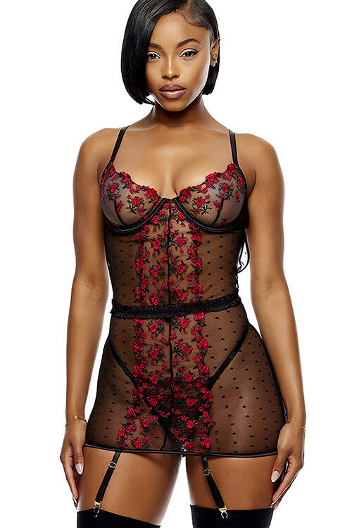 Step into a world of elegance and allure with the Forplay Bed of Roses 3 Piece Embroidered Chemise Set. This exquisite ensemble is designed for the modern romantic who desires to feel both beautiful and confident. With its stunning floral embroidery and playful polka-dot mesh, this set is sure to make you the center of attention.
