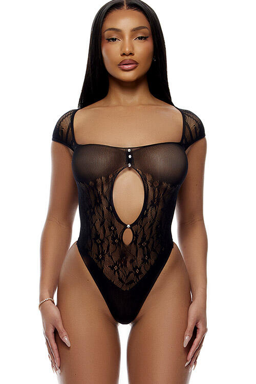 Crafted for the ultimate tease, this bodystocking includes a built-in opaque bra and panty outline, giving the illusion of layered elegance while revealing just enough skin to spark curiosity. The unique criss-cross back detail adds an unexpected twist, enhanced by sparkling rhinestone accents that catch the light with every movement, making you the center of attention.