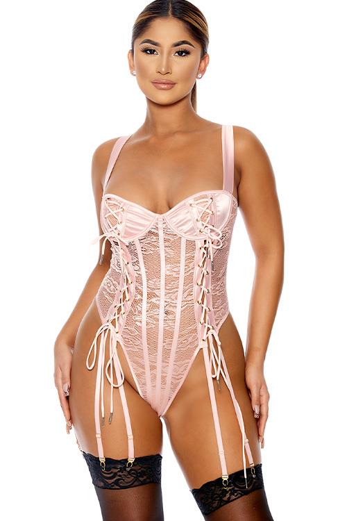 Step into a world of seduction and elegance with the Forplay Lovebound Pink Lace Corset Garter Teddy. This exquisite piece is designed to enhance your natural beauty and empower your confidence, making it the perfect addition to your intimate wardrobe.