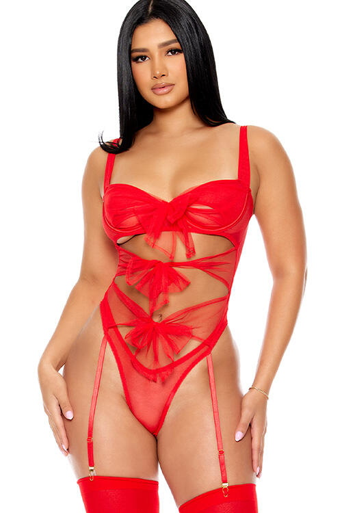 Crafted from luxurious mesh, this red teddy features delicate tulle bow accents that beautifully highlight your waist and enhance your bust, creating a silhouette that is both flattering and feminine. The intricate cutout design adds a playful touch, ensuring you feel both sexy and confident.