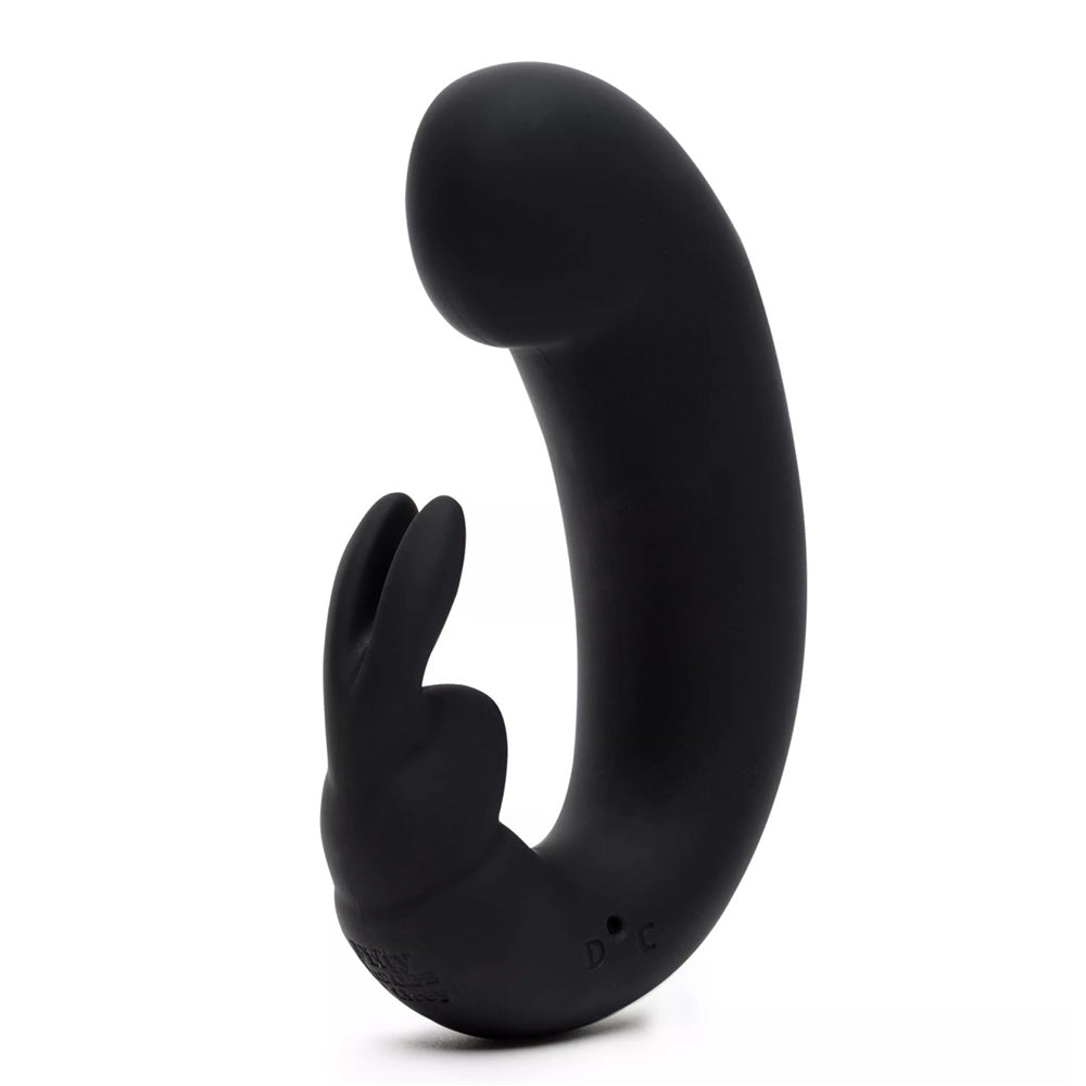 The FSOG Sensation Rechargeable G-Spot Rabbit Vibrator includes a USB charging cable and a stylish REPREVE® fabric storage bag made from 100% recycled plastic, making it both convenient and environmentally conscious. As part of the Fifty Shades of Grey Official Pleasure Collection, it is approved by author E. L. James and crafted with sophistication in mind. This toy is rechargeable, features a handy travel lock for discretion, and is fully waterproof and submersible for easy cleaning and bath-time fun.