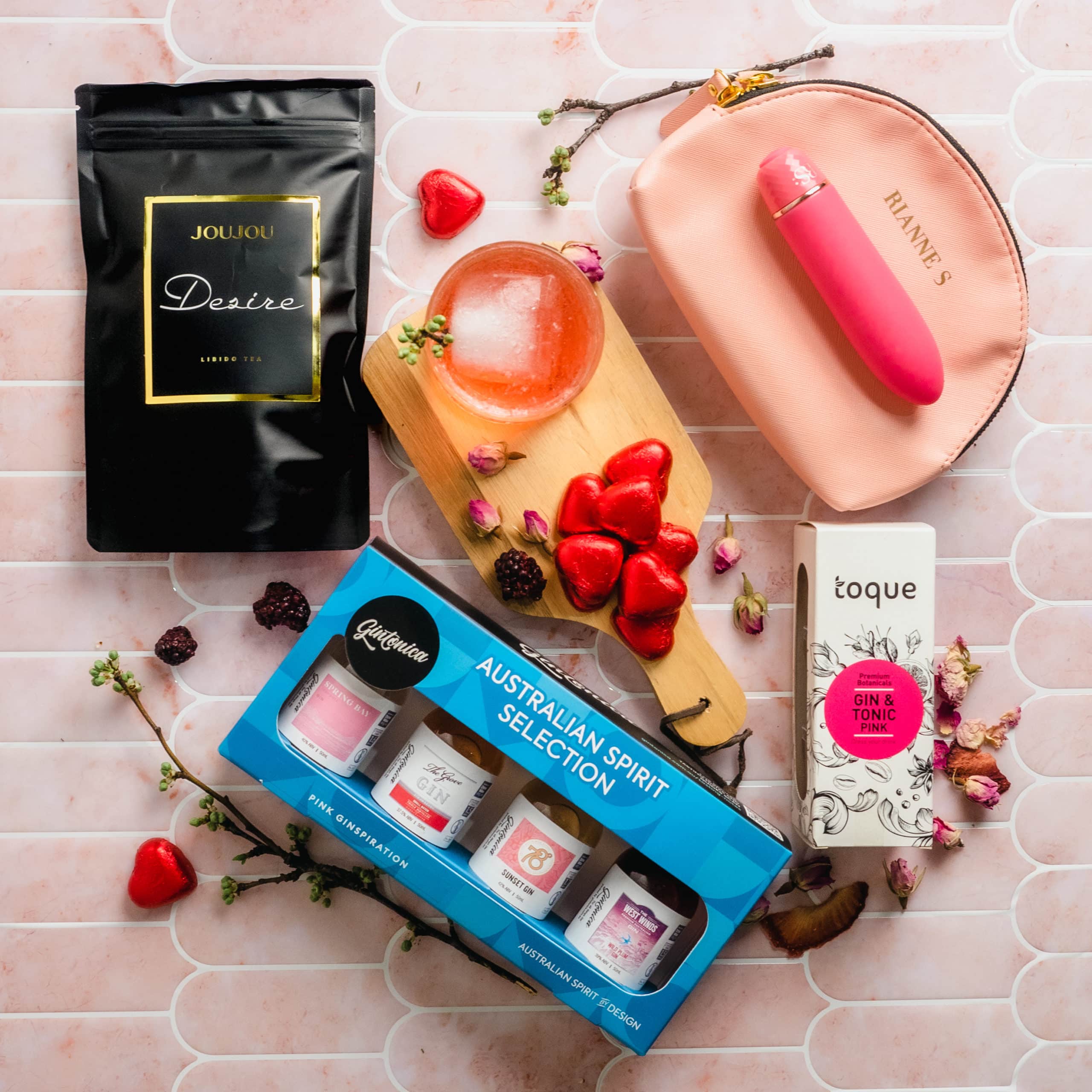 Elevate your girls’ night in with the Good Vibes & Gin Bundle by JOUJOU x Gintonica. This delightful package combines everything you need for a memorable evening, wrapped in a stylish pink theme. Enjoy delicious pink gin, tantalizing libido tea, perfectly curated garnishes, and a delightful vibrator for an unforgettable experience!