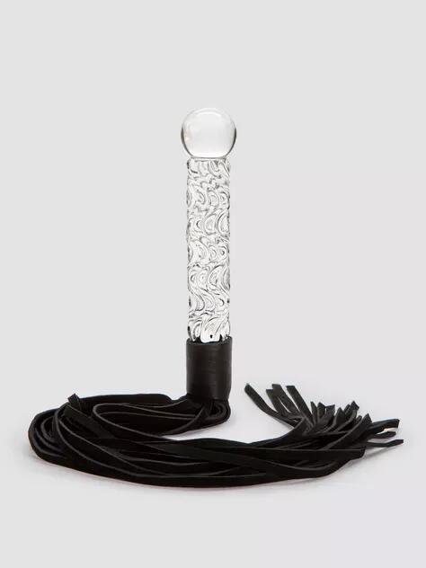The term ‘slap and tickle’ gets a whole new meaning with this all-in-one glass dildo and flogger. Featuring lengthy suede fronds at one end and a weighty, ridged dildo with a ball-ended tip at the other, it’s the perfect balance of pleasure and pain. The heaviness of the glass dildo handle gives this flogger an incredible weighted swing for varied impact and an elegant look to boot. With 30 fine suede leather tails measuring 18. 5 inches in length, you can either trail the fronds across your lover’s skin for a stimulating tickle effect, or swing the whip for a harder thud or sting. Measuring a fulfilling 6. 5 inches in length, the swirled shaft of the dildo provides an exquisite sensation when massaged against internal or external pleasure points. Its wide, ball-shaped tip is perfect for P- or G-spot stimulation, giving a heavy, full sensation for extra-intense climaxes. An attractive and desirable whip made from hand-blown glass and suede leather. Use with a generous squirt of lubricant to enhance your pleasure.