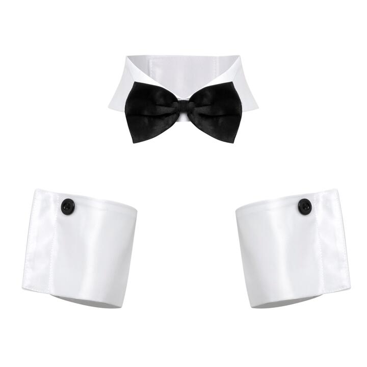 Channing Tatum’s got nothing on you in this tux-style collar and cuff set with Velcro fastenings. Perfect for playing beefy butlers, well-proportioned waiters, or indulging a Bond-esque fantasy, all you need to add is some Donna Summer and a cheeky smile. Both the collar and cuffs feature adjustable fastenings to give a comfortable fit for most sizes. A black bow tie at the neck and buttons to the cuffs create a super-sexy formal style, which is finished with soft, smooth satin.