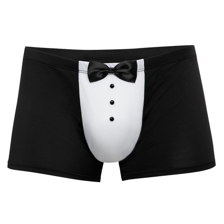 It’s been said that formalwear on men has the same effect as lingerie on women, so these tuxedo-style boxer shorts should give you double the pulling power. With a faux shirt front panel and butt-hugging stretch fabric, they’re ideal for sexy role play. The central white panel features a satin bow tie to the waistband, and 3 x faux buttons to complete the smart tux look. Perfect for playing out espionage, waiter, or butler fantasies, or just to add a special touch to those big occasions, these trunks are a great way to spice up your romping routine. Model is 6′ 0′ with a 32′ waist, and wears a size S/M.