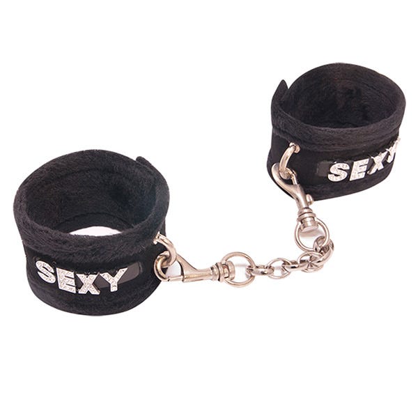Luxurious Design: Soft faux fur lining for ultimate comfort. Eye-Catching Detail: 'Sexy' diamante embellishment for added flair. Adjustable Fit: Velcro fastenings for a secure and perfect fit. Versatile Use: Includes D-rings for attachment to restraints or chaining.