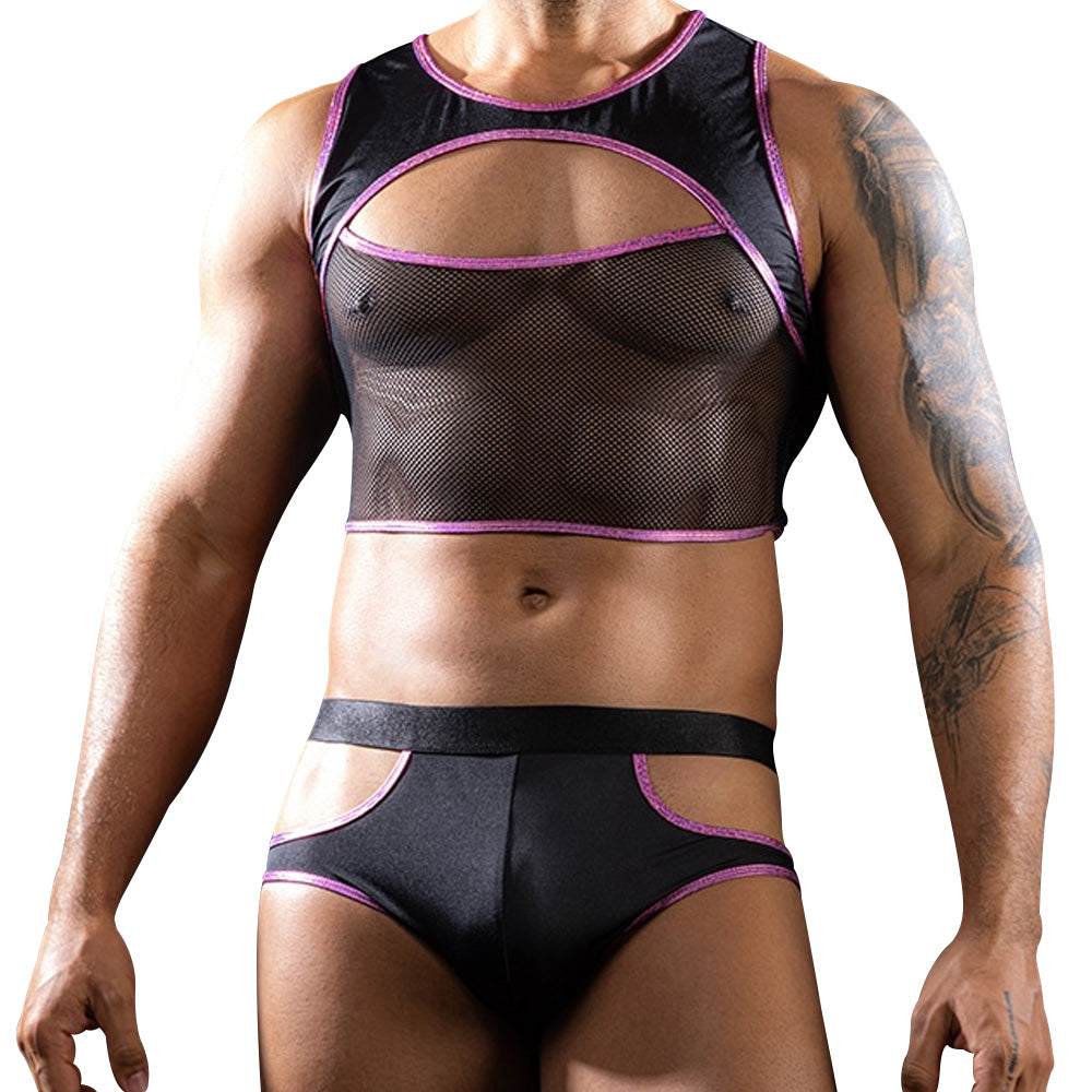 Unleash your confidence with the Love In Leather Top & Brief Set. This striking two-piece ensemble is designed to make a statement from every angle, featuring daring cut-outs and electrifying holographic pink edging that pops against a sleek black background. Crafted from a comfortable stretch knit blend, this set is perfect for those bold enough to embrace their inner desires.