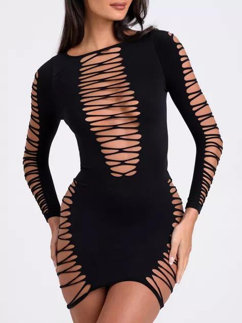 Crafted from a luxurious soft-stretch fabric, this dress hugs your curves in all the right places while providing a comfortable fit that allows for easy movement. The ultra-revealing criss-cross detailing across the front, thighs, and arms adds a tantalizing touch, leaving just enough to the imagination while still offering a hint of allure. The opaque back and side panels provide a perfect balance of coverage, allowing you to feel confident and sexy.