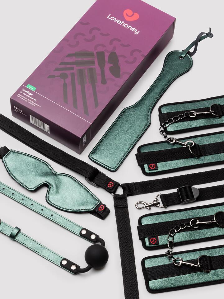 Indulge your adventurous side with this stunning Lovehoney Bondage Kit, a 6-piece collection designed for all levels of kink that delivers quivers of restraint and sensation play. Made in a fabulous green metallic colourway, it includes everything you need to explore power dynamics with confidence. Its soft-lined ankle and wrist cuffs feature Velcro fastenings and lobster clips that allow you to bind your partner as comfortably as they deserve. The under-bed restraint system helps to transform almost any size bed (including a super king) into a bondage playground, keeping your partner securely spread for full access to their pleasure. Complete your adventure with a plush blindfold to heighten anticipation, a silicone ball gag for delicious silence, and a firm paddle for satisfying impact play. Adorned with complementing gunmetal hardware, it strikes the perfect balance between style and functionality, whether you’re a curious beginner or looking to expand your collection. Measurements: Blindfold: 8” x 2.75” (size), length of elastic: 8″ and expands to 16” – unstretched Handcuffs: 9” in length, 4” additional Velcro length, 8.25” chain length Wrist cuffs: 11” in length, 4” additional Velcro length, 8.25” chain length Paddle: 18” total length, 12.5” paddle, 6” length handle Ball Gag: 5.25” circumference on ball, 24.5” total length, 5.5-8” diameter Bed Restraints: Suitable for almost any size bed (including super king), the cuff straps each extend to 4 feet 2 inches, while the connecting strap extends to 4 feet Materials: Ankle & wrist restraints: 30% PU, 30% Polyester, 40% Polychloroprene Blindfold: 80% Polyester, 10% Polyamide, 10% Polychloroprene Under-bed restraints: 100% Polypropylene Ball gag: 80% PU, 5% Iron, 15% Silicone Paddle: 58% PVC, 40% Polyester, 2% Iron