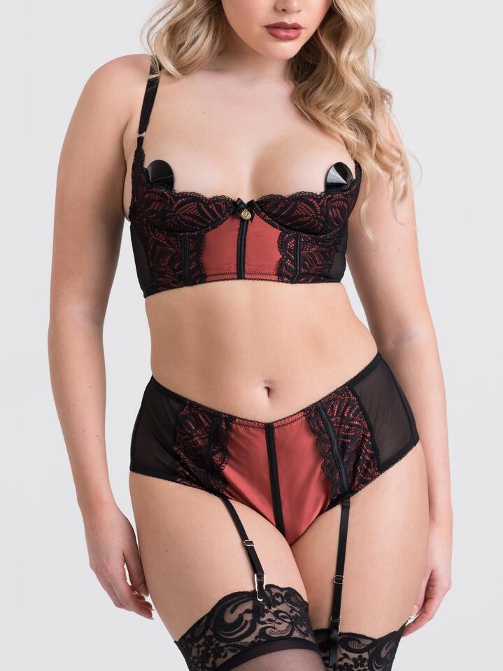 Dazzle your lover in this seductive bra set from our Dark Paradise Collection. Soft satin, leaf-patterned, stretch lace and sheer mesh combine for a deliciously sexy look that offers support, shape, and lashings of erotic appeal with its body-sculpting boning, revealing quarter cups and matching open-back knickers. Designed to accentuate your assets, the longline bra features cleverly concealed boning at the front for a corset-style look, and fastens at the back with a hook-and-eye tab for a flattering fit. Its adjustable dual shoulder straps lift and enhance your gorgeous cleavage, while the underwired quarter cups leave your love buttons on show. Add a pair of nipple tassels or pasties for an extra level of tease. Echoing the detail of the bra, the matching crotchless knickers feature a cheeky open-back that shows off your pert behind, while the removable suspender straps can be easily clipped to your favourite pair of stockings, and adjusted for a figure-loving fit. Pasties and stockings not included. Model is a size 8 and 5’9″ with a 10DD bust. She is wearing a size Small. Bra: 49% Polyester, 43% Polyamide, 8% Elastane Suspender Thong: 51% Polyester, 41% Polyamide, 8% Elastane Gusset: 100% Cotton Excluding trims