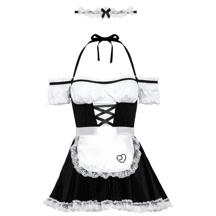 The best memories are maid in the bedroom, so get ready for some first class room service in this fantasy costume. Featuring a butt-skimming dress, matching accessories and plenty of ‘ooh la la’, this set adds a touch of sex appeal to spring cleaning. The dress features a Bardot neckline, showing off plenty of skin and just a hint of cleavage. While your shoulders are left invitingly bare, halterneck straps keep the dress in place, all while giving your boobs a gentle lift. The micro-mini cut of the dress skims your thighs and gives your lover a glimpse of your butt when you twirl around, while the corset-style waist cinches you in and highlights your figure. There’s also a matching headpiece and choker to complete the French maid fantasy. Model is a 30F, 5’6′ and a UK dress size 8. She is wearing a size S/M. Main Fabric: 90% Polyester, 10% Elastane Other: 65% Cotton, 35% Polyester Satin: 97% Polyester, 3% Elastane Excluding trims