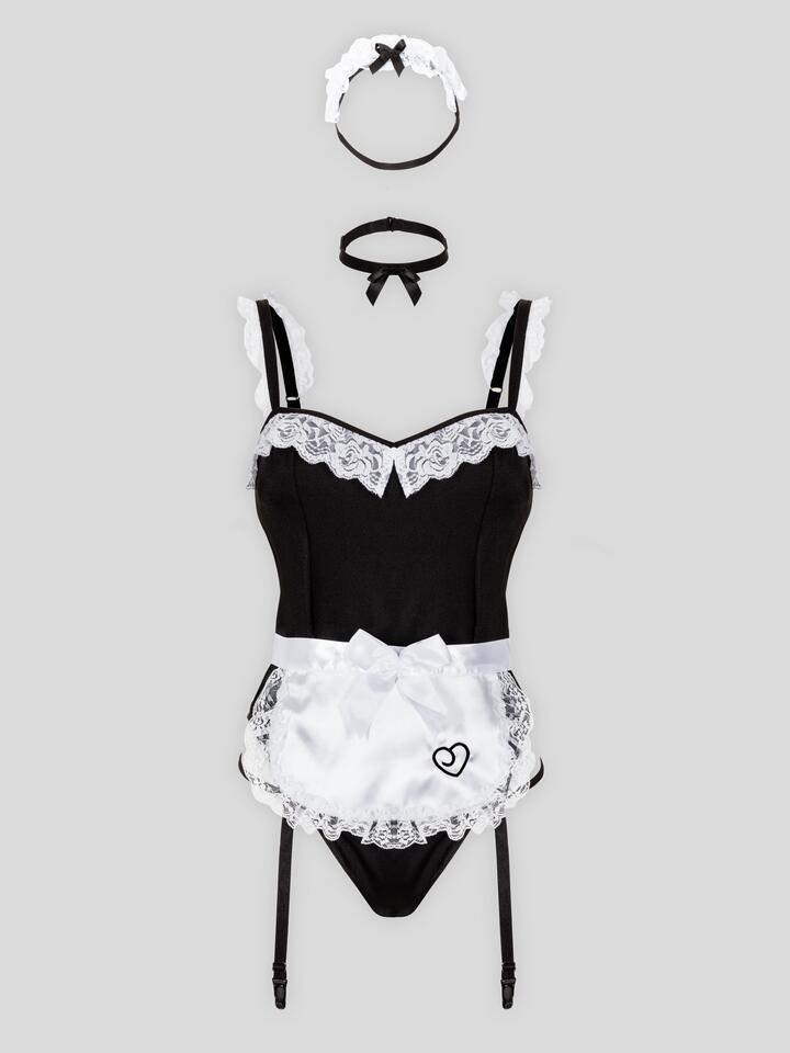 Bend over backwards to get a polished look with this fun and flirty French maid’s outfit. Perfect for seductive role play, the super-sexy, lace-trimmed basque boasts a satin apron and suspenders. A ribbon choker, G-string and headband complete the job. You won’t be able to let the dust settle as this fabulously feminine costume will inspire all kinds of naughty thoughts. Made from flattering microfibre, the basque is saucily styled with wide elastic criss-cross detailing, while the adjustable suspenders show off your peachy cheeks to perfection. White lace ruffles on the adjustable straps, bows on the elasticated headband and a Lovehoney heart embroidered on the apron add extra allure to this dressing-up dream. This set also includes a matching microfibre G-string with a cotton gusset for comfort and prolonged wear. Add your choice of lace-topped stockings and a feather duster to finish off this luscious look. Please note: feather tickler not included. Model is an AU size 18 and 5’9′ tall with a 16G bust. She is wearing One Size Queen.