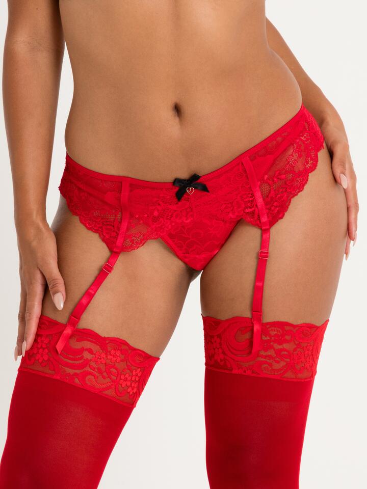 You’d better have a cold compress ready, because this bright red suspender belt is smokin’ hot. Fiery red lace shaped into pretty arches gently wraps around your hips, whilst giving the illusion of longer legs and a bottom so pert it’s simply peachy. Deep lace flatters and streamlines your natural hourglass shape, as its 4 adjustable suspender straps get to work on keeping your sexy stockings straight and wrinkle-free. Add a matching red bra and knicker set into your racy equation and prepare for a night of scarlet passion. Model is AUS dress size 8 with 34 inch hips. She is wearing a size Small.