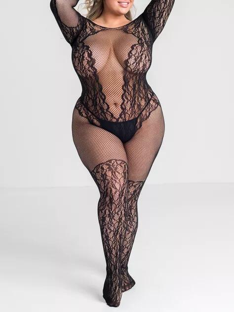 Unleash your inner seductress with the Lovehoney Plus Size All About That Lace Fishnet Bodystocking. This stunning piece is designed to accentuate your curves and leave your partner utterly captivated. Crafted from a luxurious blend of lace and fishnet, this bodystocking features a plunging neckline that beautifully highlights your cleavage, while cheeky cut-outs at the rear add a daring touch. The intricate floral embroidery paired with the sultry fishnet creates a mesmerizing visual that draws attention to your most alluring areas, especially your backside.