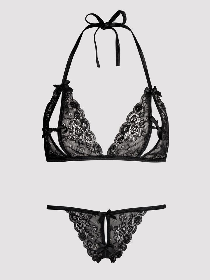 Lovehoney Plus Size Black Lace Peek-a-Boo Bra and Crotchless G-String Set – One Size Queen – Black
