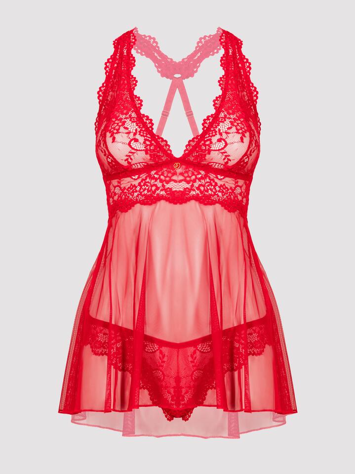 Feast your eyes on the ultimate babydoll. Designed for seduction, this seriously slinky set is an irresistible combination of red lace and revealing mesh. Once your lover sees the plunging cups and sheer, booty-skimming skirt, they’ll be speechless. Made from delicate scalloped lace, the plunging cups leave your cleavage distractingly on show. A lightly elasticated lace underbust band provides gentle support and comfort, and makes this unbelievably sexy babydoll a cinch to slip into and – more importantly – out of. To the rear, adjustable racerback straps draw the eye to your back and shoulders, leaving plenty of skin on show. Visible through the sheer mesh skirt, the matching thong makes the most of your booty, tempting your lover in for a closer look. Model is an AU size 18 and 5’9′ tall with a 16G bust. She is wearing a size 1X/2X. Lace: 90% Polyamide 10% Elastane Mesh: 95% Polyester 5% Elastane Gusset: 100% Cotton