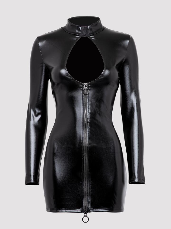 Celebrate your sex appeal in this fiercely sexy, thigh-skimming wet look dress. Featuring a hook-and-eye collar and a keyhole neckline for a killer cleavage, with a full-length front zip to tease and tempt, this long-sleeved beauty screams ‘siren’. Wear this fetish-inspired dress in the club, or save it for a more intimate setting and let your lover feast their eyes on your curves. Encouraging uninhibited frolics, the zip runs from cleavage to thigh. Soft, comfortable wet look fabric makes this lust-inspiring LBD perfect for all-day or all-night wear. Model is an AU size 18 and 5’9′ tall with a 16G bust. She is wearing a size 1X/2X. Own your sexuality, explore and express your sexual desire, and create the sex life you want in Fierce by Lovehoney.