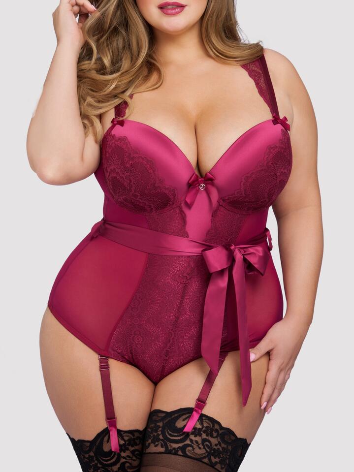 A sumptuous addition to the Lovehoney lingerie collection, the wine-coloured Moonlight body is lovingly adorned with delicate lace accents and features deep, plunging cups for a seductive ensemble designed to work in perfect harmony with your shape. While your breasts are given a gentle lift thanks to the plunging, underwired cups, adjustable shoulder straps trimmed with lace lead into a delicate panel that fastens behind your neck. To the front, a contoured, lace-covered satin panel combines with two mesh panels to create an awe-inspiringly beautiful silhouette, while a satin belt ties at the waist to accentuate the hourglass shape. An entirely transparent back leaves your derrière delightfully on show and encourages trailing kisses along the length of your spine, while the crotchless design leaves your most intimate area entirely uncovered. To complete your impossibly indulgent boudoir look, clip lace stockings to the suspenders and add a luscious berry lip for extra oh là là. Unleash your inner twilight femme fatale in Moonlight, our most temptingly luxurious collection yet. Model is an AU size 18 and 5’4′ tall with a 14DD bust. She is wearing a 1X/2X.