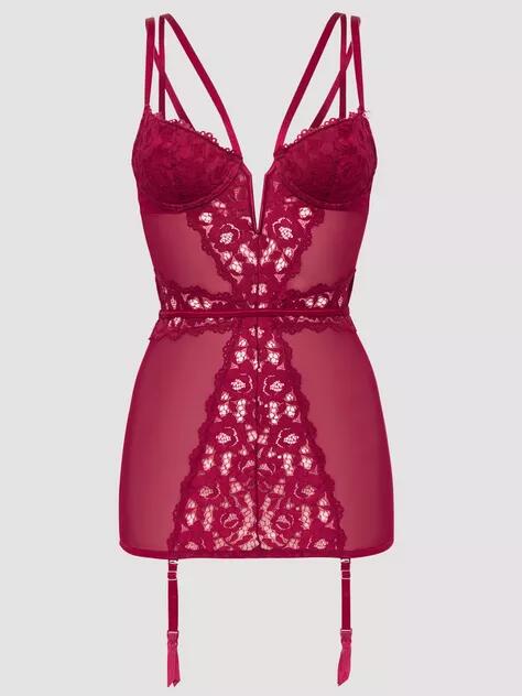The underwired cups provide ample support while enhancing your natural shape, and the daring V plunge neckline adds a touch of daring sophistication. The chemise gracefully slides over your body, smoothing your silhouette and highlighting your best features. With contoured lace panels that cinch at the waist, this piece is designed to flatter and accentuate your curves from every angle.