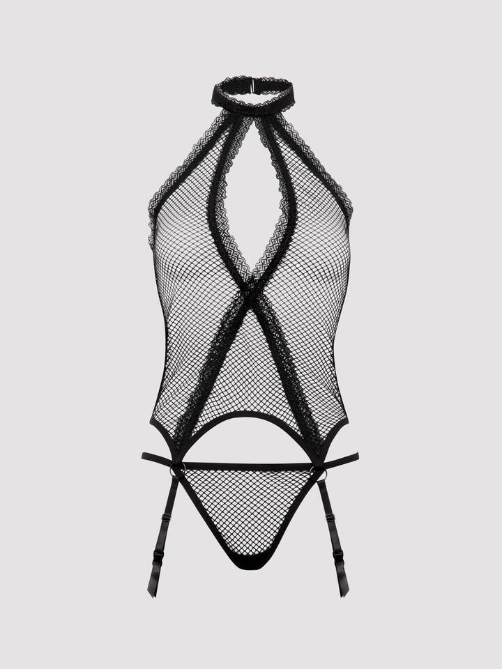 This undeniably raunchy bustier set is part of our Provocatease collection – so hot we invented a sexy new word to describe it! Super revealing, the flirty fishnet, low scoop back, boobalicious cut-out and skimpy G-string are an exhibitionist’s dream. Hugging some of your best bits, and leaving others on show, the halterneck bustier features a curve-enhancing criss-cross lace design to the front, and a deliciously revealing cut-out. To the hem, four O-rings lead into suspender straps, so you can add your favourite stockings, while a G-string frames that beautiful behind. Model is an AU size 18 and 5’10½’ tall with a 22E bust. She is wearing a One Size Queen. Lace 90% Nylon 10% Spandex Fishnet 90% Nylon 10% Spandex Gusset 100% Cotton Excluding Trims