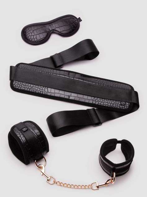 Crafted from premium black vegan leather, this collection features stunning crocodile skin-like wrist restraints, a soft elasticated blindfold, and an adjustable position strap. Each piece is lined with sumptuous velvet, providing a soft touch against the skin while enhancing your sensory experience.