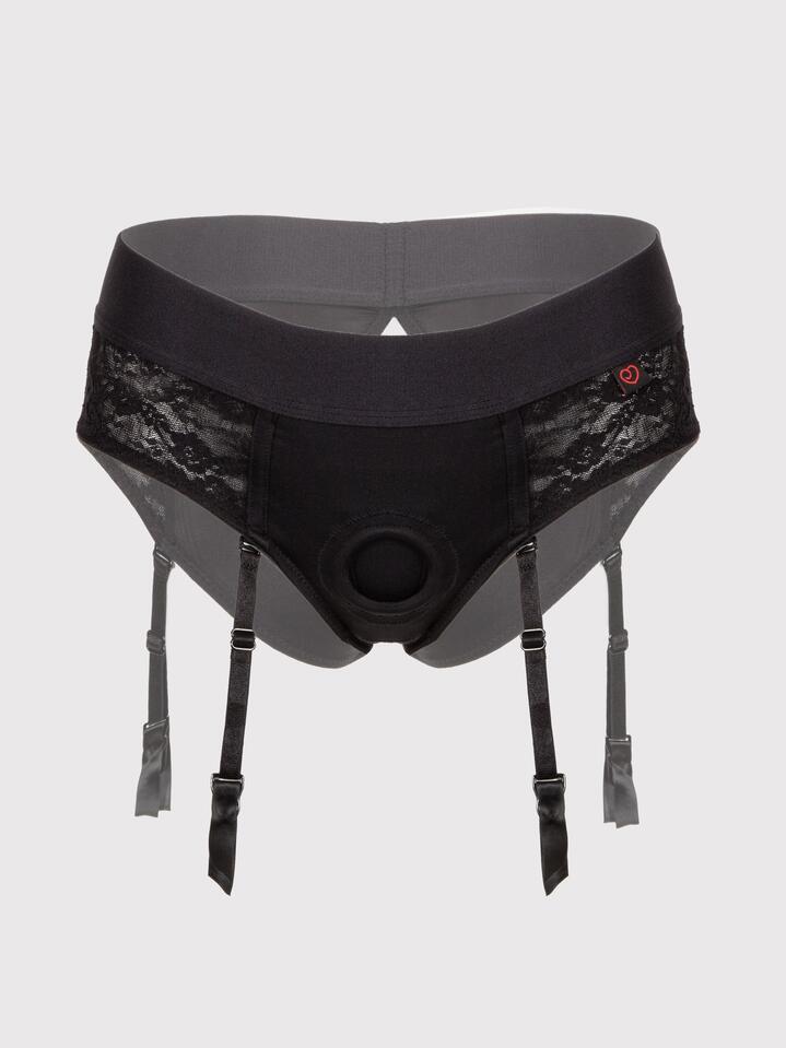 Peg in effortless style with these flirty harness briefs, and discover your sensual strap-on adventures. Crotchless, and with an open back for easy access and enhanced mutual pleasure, the only straps around here are the suspenders. Lace panels align the sides of the briefs and provide a flirty feel while the elastic waist ensures total comfort. Removable suspender straps allow you to wow with the choice of adding stockings to your look. Non-intimidating, comfortable and cute, these briefs are a perfect accessory for strap-on beginners, peggers, packers, and fashionistas alike. Slip the toy of your choice into the briefs and let play commence. Wear these briefs with benefits as everyday underwear or slip your favourite strap-on dildo into the O-ring for versatile strap-on play at a moment’s notice. They’re compatible with dildos with a 4.75 inch circumference and, thanks to a through-and-through O-ring design, can be worn with strapless strap-ons too. Please note: Dildos and bullet vibrators not included. Our model is an AU size 12 and 5’6′ tall, and wears a size Medium.