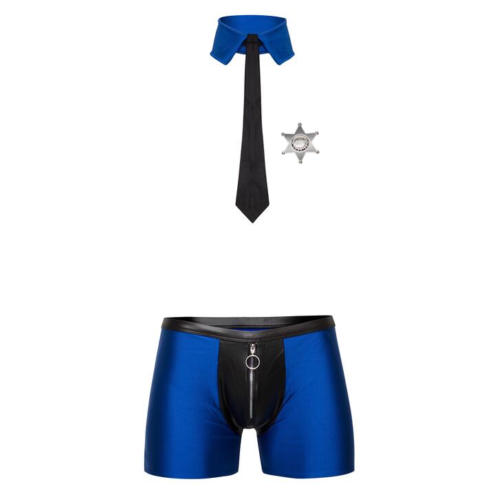 Let your lover ‘cop’ an eyeful when you flash them this raunchy uniform that’s so sexy it should be illegal. Complete with boxers, a gold badge, and a collar and tie, we’re sure you won’t have any trouble convincing your partner-in-crime to spread ’em. Opaque enough to wear without risk of indecent exposure, the blue-and-black boxers have a central zip that allows you to show them the ‘swollen’ goods whenever you desire. Just clip the badge onto the waistband, add some sturdy handcuffs and a peaked hat, and get ready to discover whether you’re a good cop, or a very, very bad one… Please note: Hat and handcuffs are not included.
