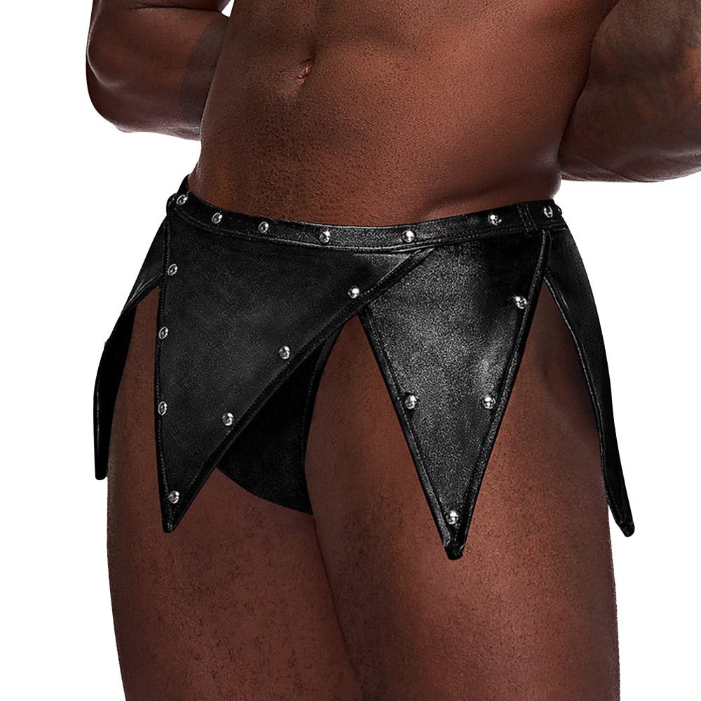 Step into a world of daring style with the Malepower Eros Man Skirt Thong. This striking black faux leather piece combines the rugged charm of a kilt with the seductive allure of a thong, creating a look that is sure to turn heads. Perfect for those who dare to express their individuality, this unique garment features cascading triangles that tease and tantalize with every movement. And with a cheeky front opening, you can make a memorable entrance wherever you go!