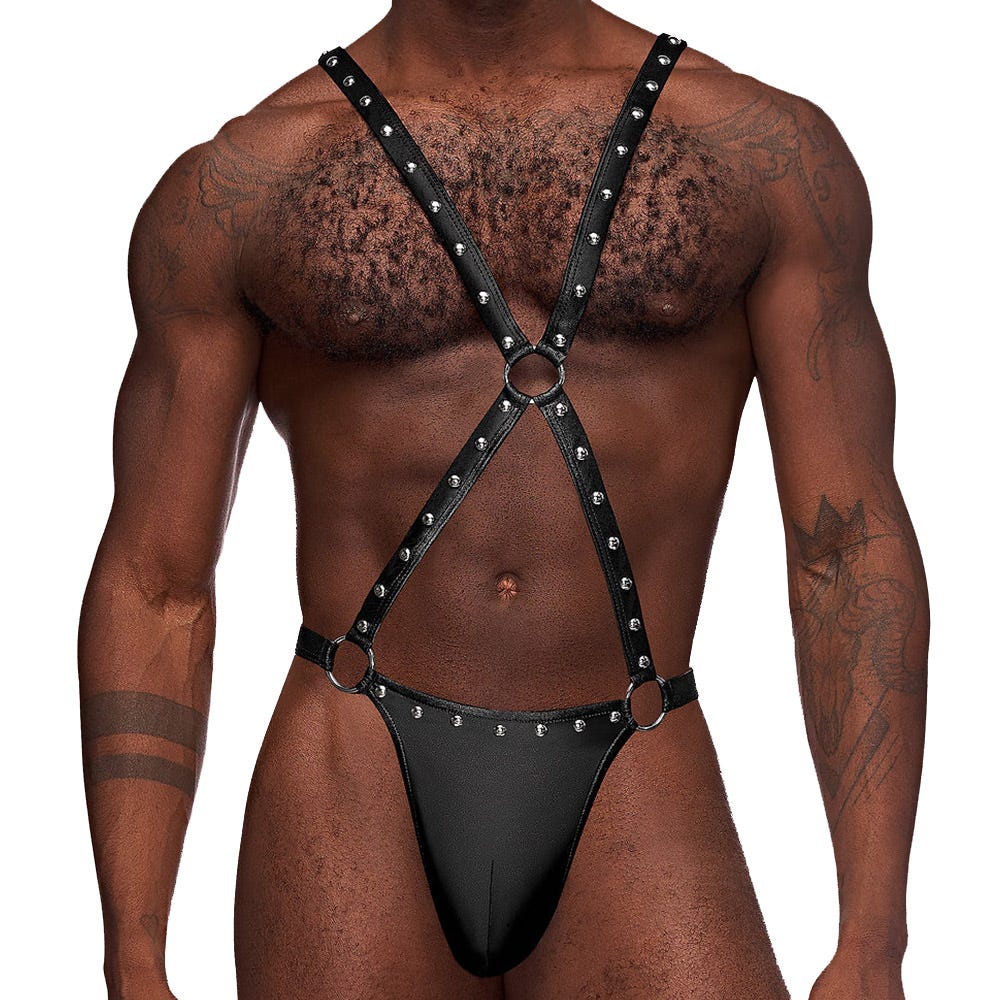 Step into a realm of fantasy and desire with the Malepower Warrior Thong & Crisscross Harness. This daring ensemble transforms you into a confident conqueror of passion, featuring a studded contour pouch that promises to captivate, while the crisscross straps accentuate your physique, leading to the tantalizing central ring. Perfect for those adventurous nights out or intimate encounters, this outfit ensures you reign supreme in the bedroom.