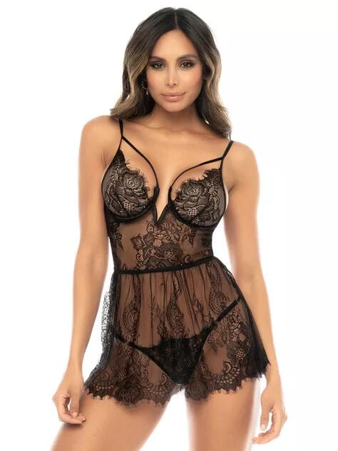 Mapale Black Eyelash Lace Underwired Babydoll Set