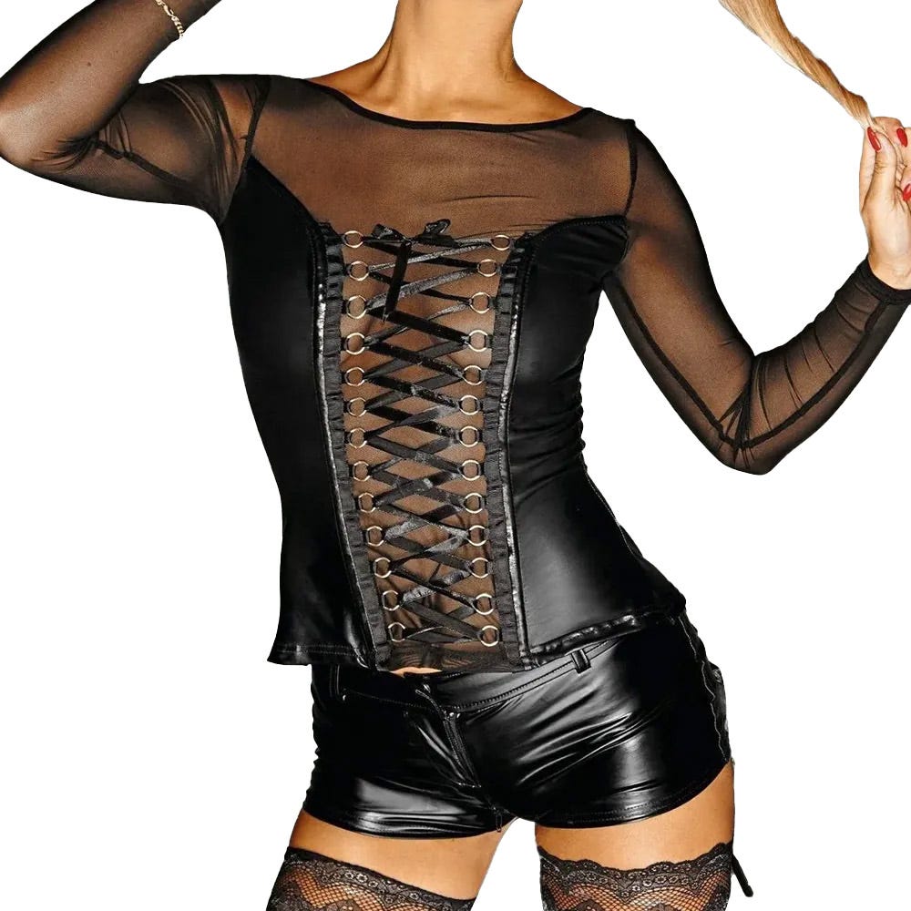 Elevate your seductive style with the Noir Power Wetlook Tulle Top. This exquisite corset top combines elegance with a sultry appeal, featuring delicate satin lacing and strategic boning that ensures a flawless fit. Designed to hug every curve, the hidden side zipper allows for easy wear while maintaining a sleek silhouette. Perfect for those special nights or whenever you want to feel empowered and beautiful.