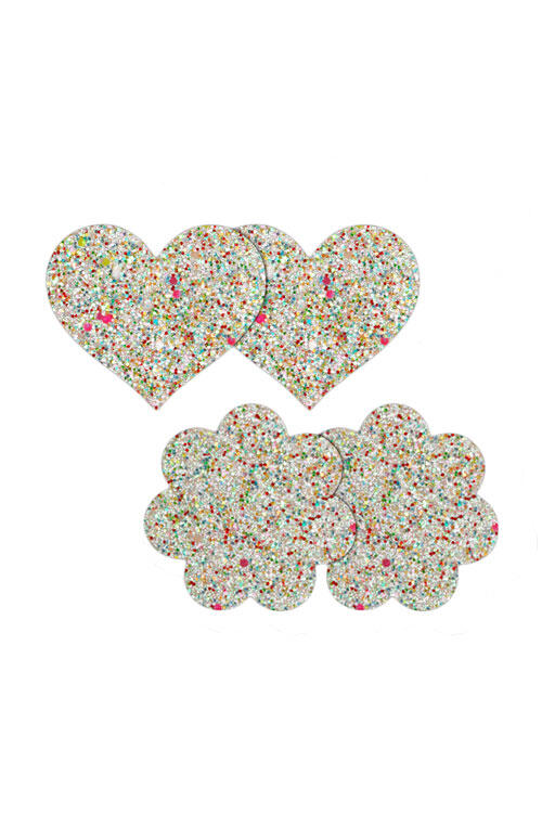 Crafted from high-quality, body-safe materials, these adhesive pasties provide a comfortable fit that stays in place throughout the night. The unique heart and flower shapes allow for versatile styling, making them ideal for layering under sheer tops, mesh lingerie, or even as a statement piece on their own. With their eye-catching glitter finish, you’ll shine bright and feel confident wherever you go.