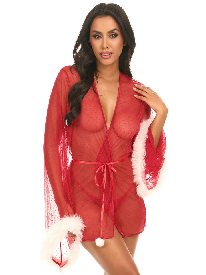Wrap yourself in holiday elegance with this flirty, sheer, pin-dot mesh Santa Robe designed to make every moment feel magical. Featuring soft, see-through mesh that teases just enough and a playful marabou trim for that glamorous festive touch, this robe is the perfect blend of naughty and nice. Lightweight and irresistibly soft, it drapes beautifully over your lingerie or can be worn on its own for a sultry holiday statement. The short length adds a flirtatious edge, while the feathered marabou detail brings a touch of vintage-inspired luxury. 90% Nylon and 10% Spandex