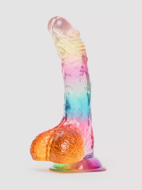 Fuel your fantasies with this stunning transparent rainbow dildo with balls. Combining ultra-realism with a gloriously artificial, rainbow colourway, this jelly-like dildo boasts 6 inches of insertable length and a 5. 5 inch girth. Its curved shaft and pronounced head is designed to stimulate your G-spot or P-spot, plus it’s harness compatible for strap-on sex and pegging thanks to its flared base. For the best experience, use your toy with plenty of water-based lubricant.